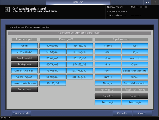 Cuando la bandeja que se selecciona automáticamente en el modo Papel auto (APS) tenga un tipo de papel distinto al especificado en este ajuste, la máquina le indicará que el tipo de papel no coincide.