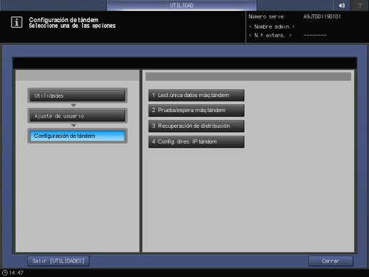 Pulse Configuración de tándem en la pantalla Menú Configuración de usuario y después pulse Prueba/espera máq.tándem.