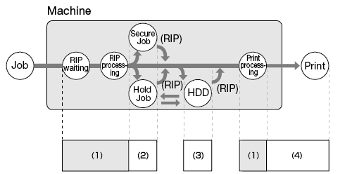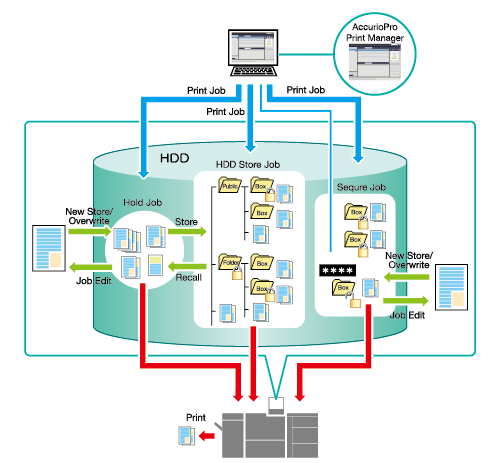 The AccurioPro Print Manager monitoring range covers a wide range from the Image Controller job data reception to the job output by the printer engine. You can check active jobs, hold jobs, secure jobs, and HDD store jobs, and also perform various operations for jobs in this range. Also, you can edit jobs in the hold job list of this system using the AccurioPro Print Manager job editing function and the page editing function.