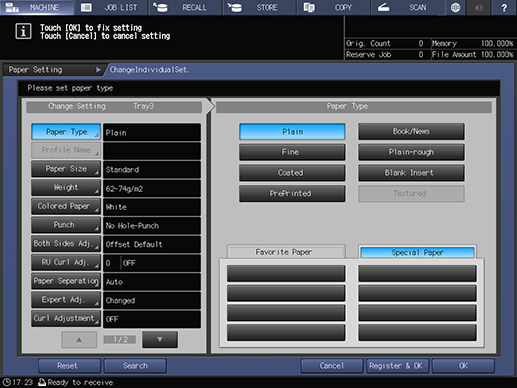 Touch panel - [MACHINE] - [Paper Setting] - [Change Set]