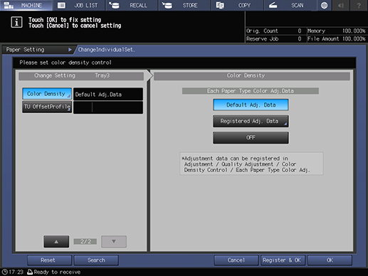 Set the sensor adjustment value used for output density adjustment. By utilizing the registered [Registered Adj. Data], it is possible to make corrections that take into account different paper characteristics such as plain paper and coated paper. | |