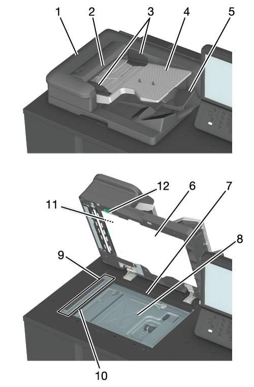 11 | Slit scan glass for back side | When using ADF, the images on the back side of the document are read in this part. This is inside the Lever [DF1] when opened. |