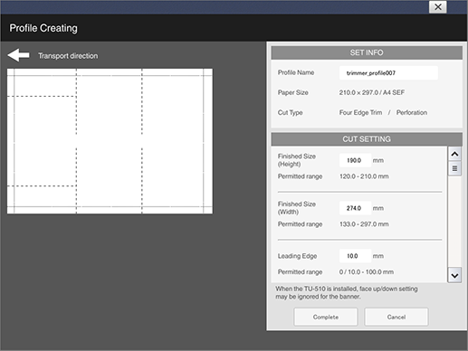Web Utilities - [Finisher Manager] - [TU-510 Profile Manager] - [Create] - Select [Four Edge Trim]. - Select [Perforation]. - [OK]