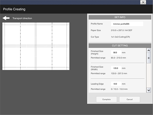 Set the finishing size for Four Edge Trim as well as the cut positions. |