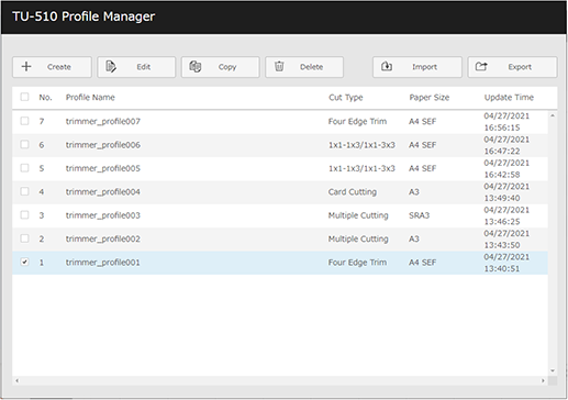 The exported trimmer file is saved on this system, and it can be recalled using [Import].
