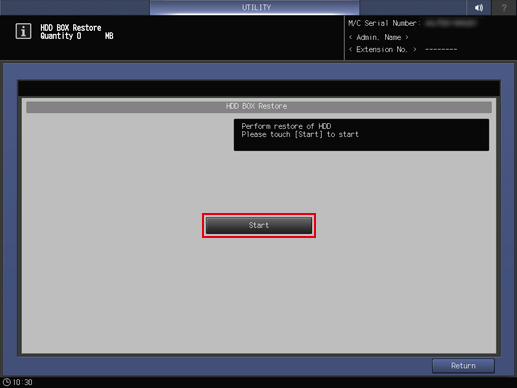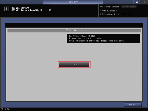 Press [Start] and a dialog box requesting confirmation to overwrite all data on the HDD is displayed. Press [Yes] to begin restoring all the data.