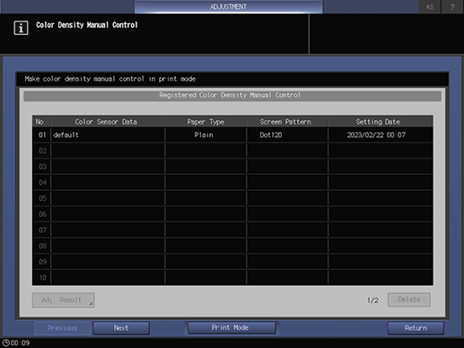 En [Control manual densidad color registrado], puede confirmar o eliminar el resultado del ajuste.