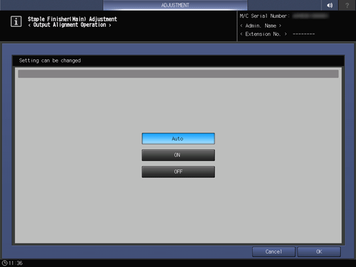 [Desact.] | Desactiva la placa de alineación de salida para todos los tipos de papel. Se reduce el volumen de ruido porque se evita el funcionamiento de la placa de alineación. También se reduce el periodo de tiempo necesario para cambiar el modo de la unidad de acabado (por ejemplo, del modo grapar al modo perforar). |