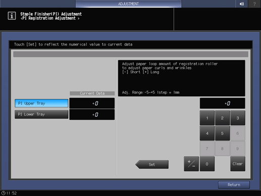 Ajuste el valor de bucle de la sección del rodillo de registro en la unidad de acabado con grapas si se suministra el papel desde la Unidad de inserción posterior PI-502.