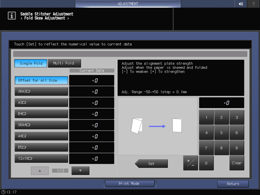 Ajuste > [Ajuste de SD] (Unidad de grapado en el lomo SD-513) > [Ajuste inclinación pliegue]