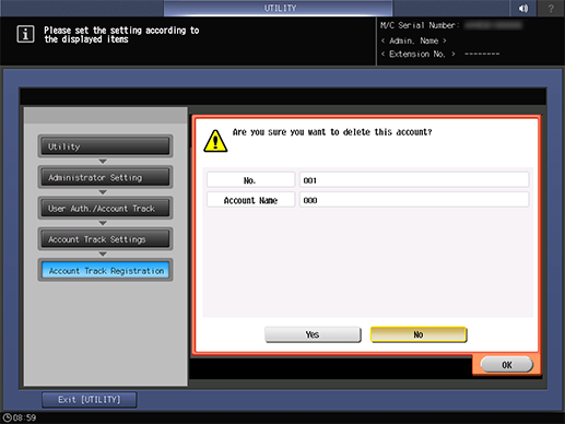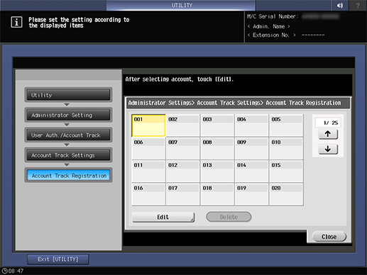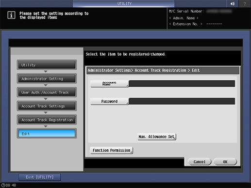 Panel de control - Utilidades/Contadores - [Conf. de administrador] - [Autent. usua./Seg. cuenta] - [Ajuste seguimiento cuenta] - [Registro seguim. cuenta]