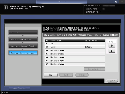 [Eliminar] | Elimina el servidor externo seleccionado en la lista de servidores externos. Si se elimina el servidor externo predeterminado, el siguiente servidor externo registrado de forma consecutiva se establece como el predeterminado. |