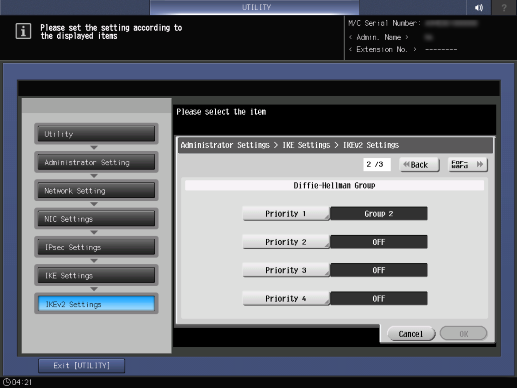 [Grupo Diffie-Hellman] | [Prioridad1] a [Prioridad4] | Permite definir el Grupo Diffie-Hellman que se utilizará para generar la clave común requerida para la comunicación en cada orden de prioridad. Diffie-Hellman: método de entrega de la clave común utilizado en el método de cifrado con clave común. |