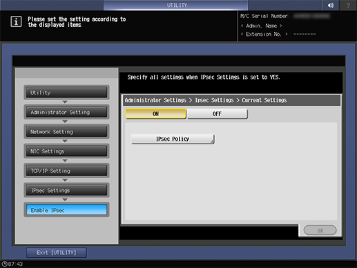 Panel de control - Utilidades/Contadores - [Conf. de administrador] - [Configuración red] - [Configuración de NIC] - [Config de TCP/IP] - [Configuración IPsec] - [Config. del uso de Ipsec]