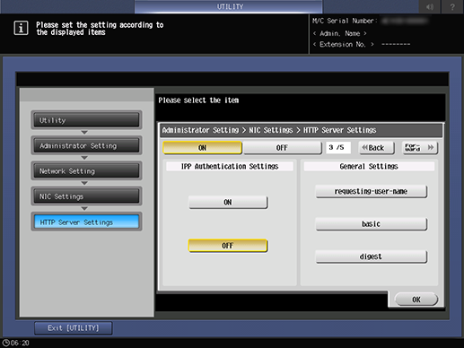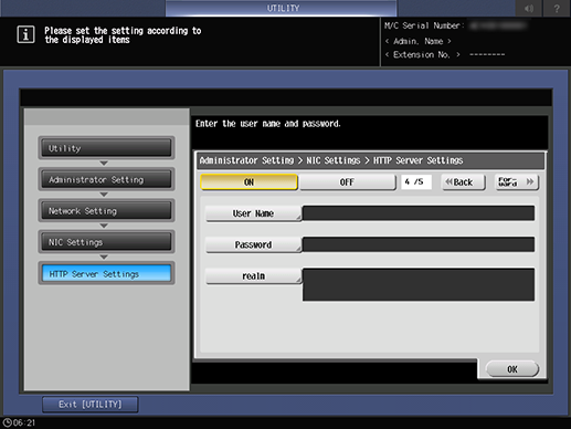 [Nombre de usuario] | Define el nombre de usuario para la autenticación de servidor HTTP. Se pueden introducir hasta 20 caracteres de un byte. | |