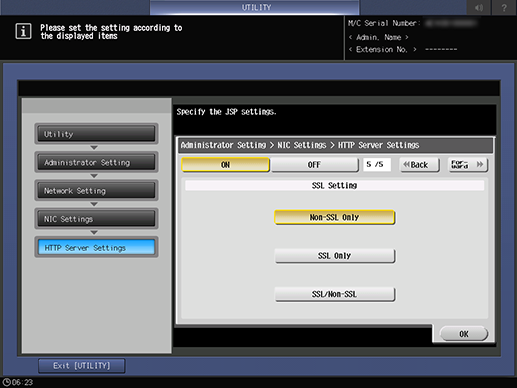 [Configración SSL] | [Sólo no SSL] | Permite la comunicación solo cuando la comunicación SSL está desactivada en los casos en que el sistema se utiliza como servidor HTTP. |