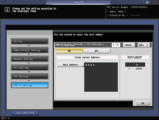 [Número de puerto del servidor proxy] | Puede definir el número de puerto del servidor proxy que se comunica con el sistema cuando se realiza un envío por FTP. Introduzca el número de puerto de servidor proxy utilizando el Teclado del Panel de control. Rango: de 1 a 65535 | |