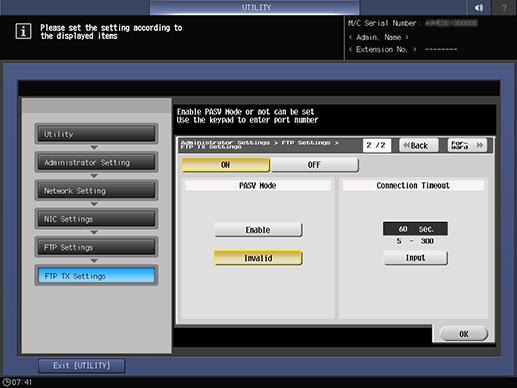 [Tiempo espera conex.] | Si transcurre el tiempo especificado sin que se realice ninguna operación mientras está conectado al servidor proxy que se comunica con el sistema para el envío por FTP, la conexión se interrumpirá. Pulse [Introducir] e introduzca el periodo de tiempo de espera con el Teclado del Panel de control. Rango: de 5 a 300 seg. |