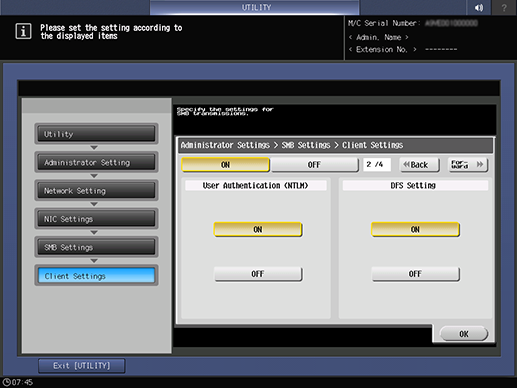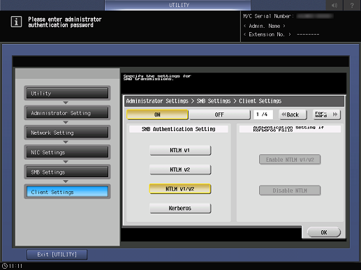 [Configuración de autenticación SMB] | [NTLM v1] | Se selecciona el formato de autenticación SMB. Para utilizar Escanear a SMB en Mac OS 10.7 o posterior, seleccione [NTLM v1/v2]. |