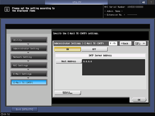 [Dirección del servidor SMTP] - [Dirección host] | [Introducir nombre de host] | Permite definir el nombre de host del servidor SMTP. Se pueden introducir hasta 253 caracteres de un byte, incluidos puntos. Si se introducen 64 caracteres de un byte o más; es necesario separarlos utilizando puntos (.). |