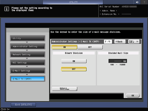 [División binaria] | [ENCENDIDO] | Ejecuta la división binaria para el correo electrónico. Puede reducir la carga del servidor de correo electrónico (SMTP). En [Tamaño correo dividido], puede especificar el tamaño para dividir. |