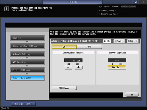 [Capacidad de servidor] | [Capacidad de servidor] | Define el tamaño máximo del correo electrónico disponible para el servidor SMTP. Para la introducción, utilice el Teclado del Panel de control. Se puede configurar cuando [Ilimitado] está desactivado. Rango: de 0 Mbyte a 100 Mbyte |