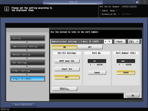 [Número de puerto (SSL)] | Permite definir el número de puerto para la comunicación SSL vía servidor SMTP. Pulse [Introducir] e introdúzcalo con el Teclado del Panel de control. Rango: de 1 a 65535 | |