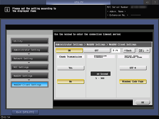 [Tiempo espera para conexión] | Si transcurre el tiempo especificado sin que se realice ninguna operación mientras está conectado al servidor proxy que se comunica con el sistema para el envío por WebDAV, la conexión se interrumpirá. Defina la duración del tiempo de espera. Para la introducción, utilice el Teclado del Panel de control. Rango: de 5 a 300 seg. | |