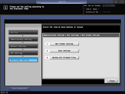 Panel de control - Utilidades/Contadores - [Conf. de administrador] - [Configuración red] - [Configuración de NIC] - [Configuración de Hot Folder]