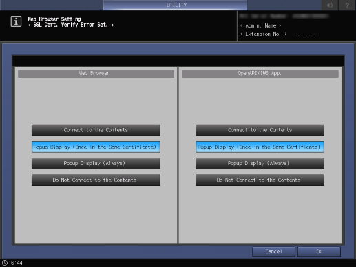 Puede configurar la operación que debe llevarse a cabo al detectarse un error relacionado con el certificado SSL cuando se utiliza un navegador u OpenAPI/una aplicación IWS.