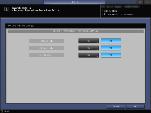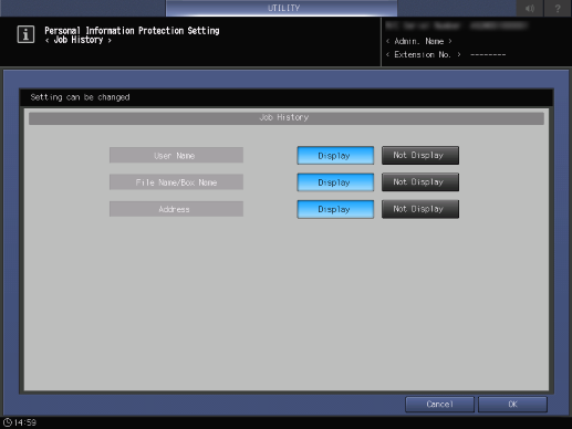 [Historial de tareas] | [Activado] | Se activa la configuración de protección de la información personal de un historial de tareas. Asigne [Nombre de usuario], [Nom.archivo/Nom.carp.usuario] y [Dirección]. |