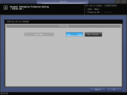 [Tarea almacenada] | [Activado] | Se activa la configuración de protección de la información personal de una tarea almacenada. Definir [Nombre de usuario]. |