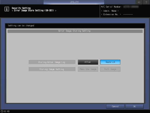 [Almacenando error registro de imagen] | [Permitir] | Se permite el almacenamiento de registros cuando se produce una llamada al servicio técnico. Los registros guardados se utilizan de una manera eficiente cuando el representante del servicio al cliente trata un problema. Puede especificar el método de guardado de la imagen en [Almacenando configuración de imagen]. |