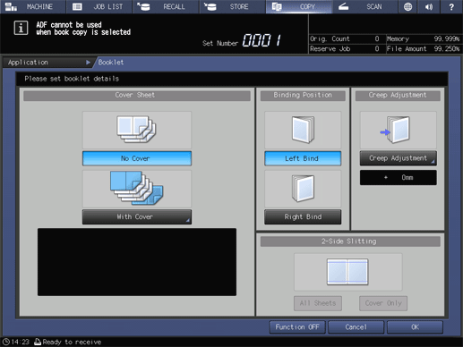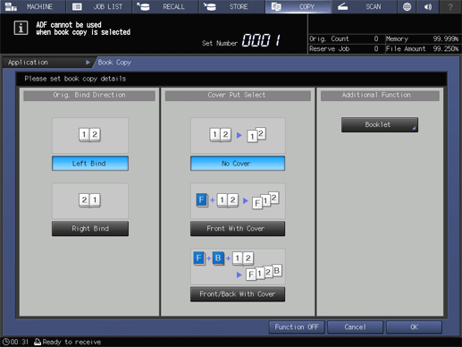 En [Copia de libros], configure [Direc. enc. orig.] y [Selección de portada] y también configure [Folleto] en [Función adicional] según sea necesario.