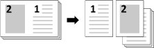 Permite escanear de una vez un original de doble página como un libro o un catálogo, y crear los datos divididos en página derecha e izquierda. Se escanean 2 páginas de datos a la vez, lo que resulta en 2 páginas cuando se hacen copias a 1 cara y en 1 página con un anverso y un reverso cuando se hacen copias a 2 caras. Se crean 2 páginas de datos cuando se escanea.