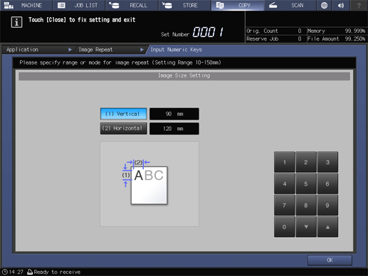También puede introducir el valor utilizando [+] / [,] a la derecha de [Ancho horizontal (mm)] y [Ancho vertical (mm)] en la pantalla mostrada en el paso 1.