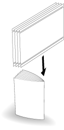 - Si se utiliza papel fino que se ondule fácilmente para el plegado central multihoja, la salida de las impresiones debe ser de manera que el papel se ondule hacia el interior. Antes de imprimir un cuadernillo, imprima solo unas pocas hojas en la Bandeja secundaria y revise la dirección de la ondulación. Si el papel impreso está curvado hacia arriba, se curva hacia dentro cuando se crea un folleto.