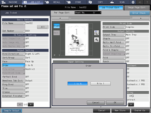 Para disponer las páginas en orden inverso, asigne a [Cara] el valor [Cara arriba] y a [Orden] el valor [1 a N]. Las impresiones se apilan por orden de páginas.