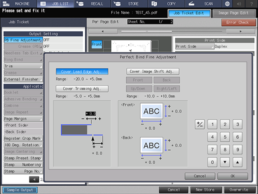 [Ajuste recorte cubierta] | Define la cantidad de recorte de la portada. Al pulsar esta tecla se visualiza el campo de entrada para el valor numérico. Rango: de -5,0 mm a 5,0 mm | |