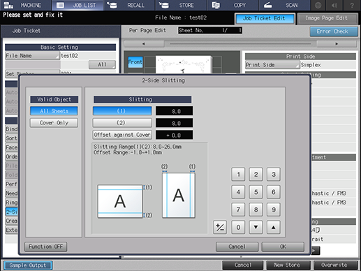 [Offset resp.a port.] | Define la cantidad de corte lateral de la tripa para la portada. Rango: de -1,0 mm a 1,0 mm (pasos de 0,1 mm) | |