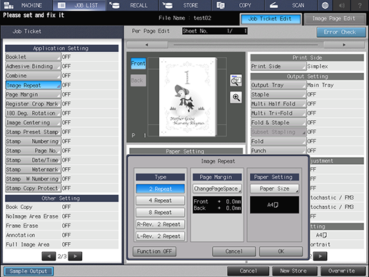 Permite ajustar el número de veces que se repite la imagen original, la posición cuando se invierte la imagen, el tamaño del papel y otras cosas.
