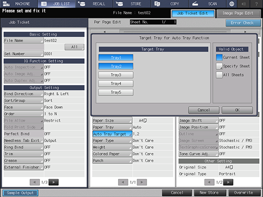 [Bandeja destino] | Teclas de selección de bandeja objetivo | Seleccione la Bandeja de papel a la que desea conmutar. Pueden seleccionarse varias Bandeja de papel. |