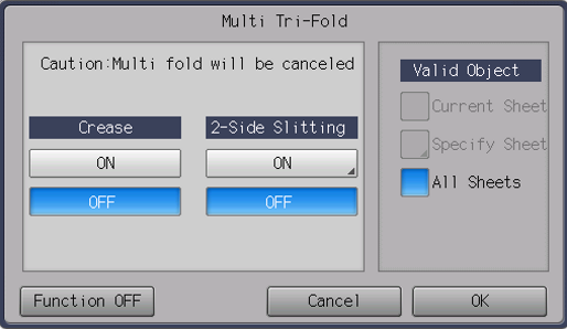 [Hendidura] | ![]() | [Activado] | Crea hendiduras solo en las portadas para plegado triple múltiple. |