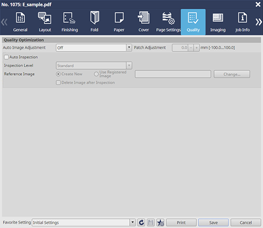 [Inspección automática]*2 | Seleccione esta casilla de verificación para llevar a cabo la inspección automática. Esta función permite comparar la imagen de referencia con la imagen de la tarea impresa para detectar manchas o errores en la imagen de la tarea e imprimir las hojas que causan problemas. | |