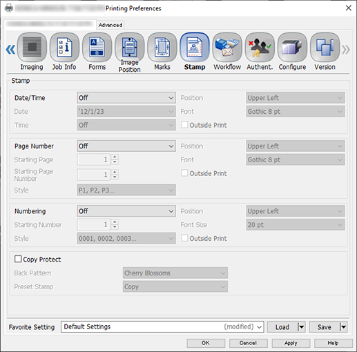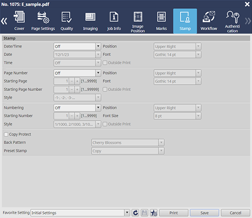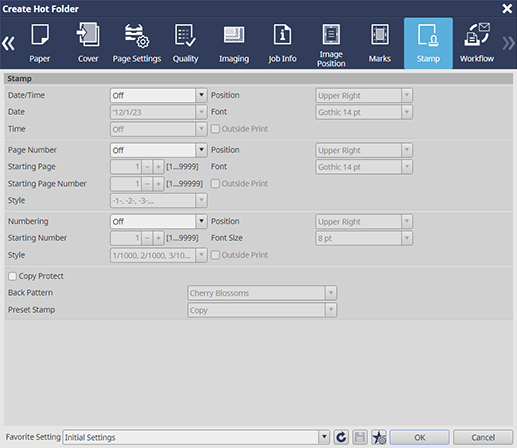 Permite configurar los ajustes para imprimir información que no está en el original ([Fecha/Hora] / [Número de página] / [Enumeración]).
