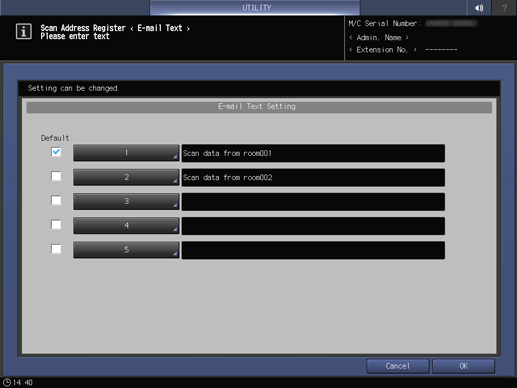 Panel de control - Utilidades/Contadores - [Conf. de administrador] - [Dirección envío escaneado] - [Config.txt. corr. electr.]