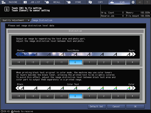 [Texto/Foto] | [-4] a [4] | Establece el valor para distinguir los datos como texto en un original con imágenes y texto mezclados. En [0], para aumentar la velocidad y distinguir los datos como fotos, pulse la tecla menos (-). Para aumentar el valor para distinguir datos como texto utilizando, pulse la tecla más (+). |