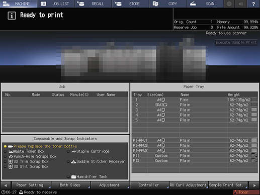 El indicador Bote de tóner se ilumina en rojo en el área de visualización [Indicadores de consumibles y residuos] de la pantalla [UN.PRINC.], y aparece el siguiente mensaje.