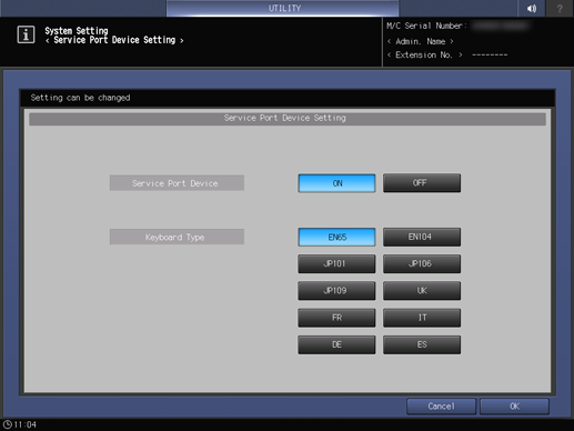 [Tipo de teclado] | Establezca el tipo de teclado conectado al Puerto de servicio (Puerto USB) del sistema. |