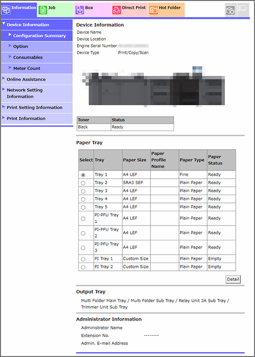[Detalle] | Muestra información detallada de la bandeja de papel seleccionada. Si hace clic en [Atrás], regresa a la vista de lista de bandejas de papel. |